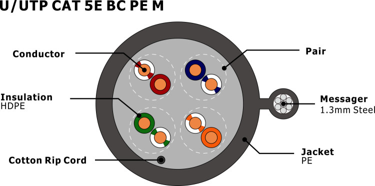 | Bouclier: | UTP, paire tordue non blindée | Nom du produit: | U/UTP CAT5E PE avec messager |