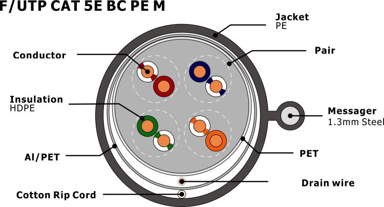 | Bouclier: | FTP, paire tordue blindée | Nom du produit: | F/UTP CAT5E PE avec messager |